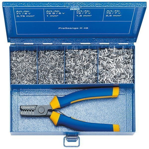 bestückt mit 4.000 verschiedenen nicht isolierten Aderendhülsen von 0,75 bis 2,5 mm² und ein Presswerkzeug K48