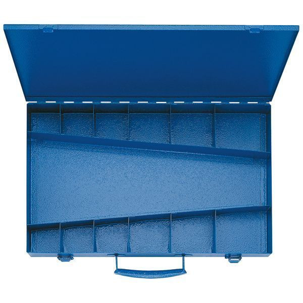 Hammerschlaglackierter Sortimentskasten, 12 kleinere und 1 größeres Leerfach mit Verschluss und Tragegriff. Zur Aufbewahrung von Presswerkzeugen der Typenreihe K 05, K 05 BC, K 35/4. Abmessungen 400x250x50 mm, Gewicht: 2,3 kg.