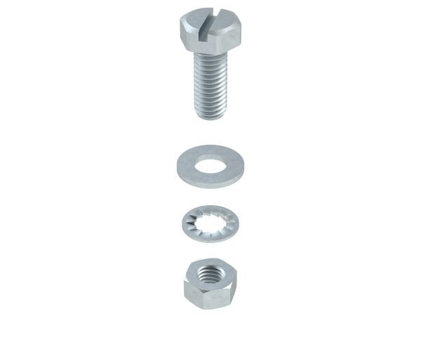 Kontaktschraube, mit Sechskantschraube mit Schlitz nach DIN EN ISO 4017 SZ inklusive Sechskantmutter nach DIN EN ISO 4032, Fächerscheibe aus Federstahl und Unterlegscheibe nach DIN EN ISO 7089-Form A. Abmessungen (ca. Maße) Gewinde : M 8 Länge : 20 mm Werkstoff : Stahl, galvanisch verzinkt