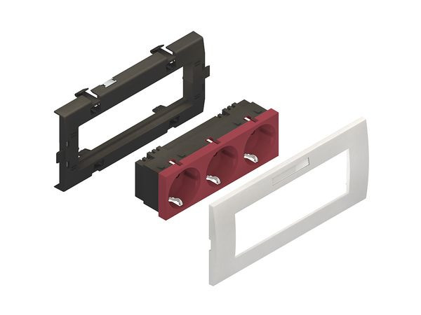 Geräteeinbausystem, vorkonfektioniert, dreifach, waagerecht, anschlußfertig vorverdrahtet, komplett mit Adapter- und Abdeckrahmen, mit Steckdoseneinsatz für EDV-Stromkreise, zum Aufrasten in die Deckelaufnahmekontur der Gerätekanäle BU65... . Empfohlen bei normaler Beanspruchung. Für besondere Beanspruchungen (z.B. Schulen, Werkstätten, Sporthallen) empfehlen wir die Verwendung unserer Geräteeinbaudosen KED... in Verbindung mit einem adäquaten Schalterprogramm. Set besteht aus : 1 x Geräteadapter, dreifach, Modul 45, mit 2 Federclips 1 x Steckdoseneinsatz, dreifach, waagerecht, mit Steckklemmen für Leitungen 1,5 - 2,5 mm², 2-polig, mit Berührungsschutz 1 x Abdeckrahmen, dreifach, Modul 45, einschl. Sichtfenster mit Etikett für Beschriftungsfeld 1 x Montageanleitung. Der Querschnitt ca. 1134 mm² ist vom nutzbaren Querschnitt des Gerätekanals abzuziehen. Abmessungen (ca. Maße) H x B : 83 x 183,5 mm für Deckelöffnung : 80 mm Nennspannung : 250V / 16A Steckdoseneinsatz Farbton : rubinrot RAL : 3003 (ähnlich) Abdeckrahmen Farbton : reinweiß RAL : 9010 (ähnlich)