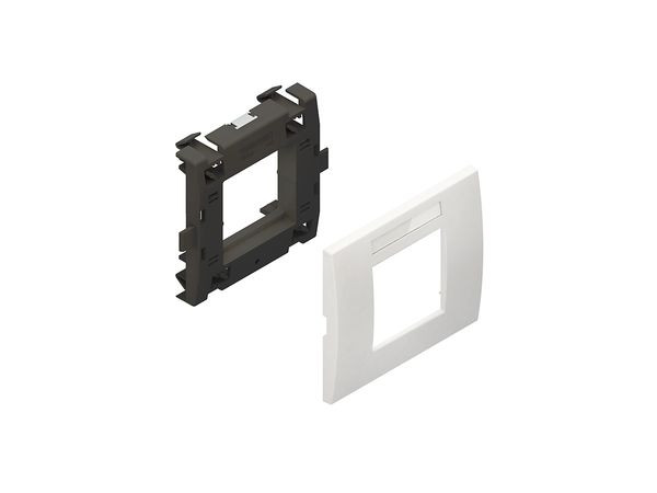 Geräteeinbausystem, Leerdose, einfach, waagerecht, komplett mit Adapter- und Abdeckrahmen, für Steckdoseneinsatz mit den Abmessungenen 45 x 45 mm, zum Aufrasten in die Deckelaufnahmekontur der Gerätekanäle BU65... . Empfohlen bei normaler Beanspruchung. Für besondere Beanspruchungen (z.B. Schulen, Werkstätten, Sporthallen) empfehlen wir die Verwendung unserer Geräteeinbaudosen KED... in Verbindung mit einem adäquaten Schalterprogramm. Set besteht aus : 1 x Geräteadapter, einfach, Modul 45, mit 2 Federclips 1 x Abdeckrahmen, einfach, Modul 45, einschl. Sichtfenster mit Etikett für Beschriftungsfeld 1 x Montageanleitung. Der Querschnitt ca. 569 mm² ist vom nutzbaren Querschnitt des Gerätekanals abzuziehen. Abmessungen (ca. Maße) H x B : 83 x 93,5 mm für Deckelöffnung : 80 mm Nennspannung : 250V / 16A Abdeckrahmen Farbton : reinweiß RAL : 9010 (ähnlich)