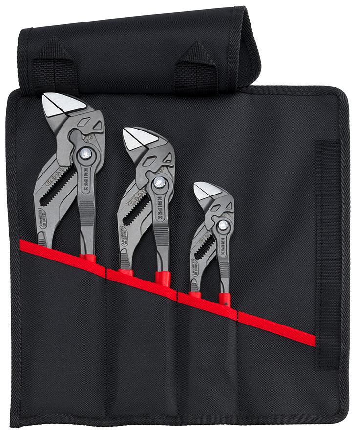 00 19 55 S11 Zangenschlüssel-Set Zangenschlüssel von KNIPEX sind hervorragend geeignet zum schonenden Greifen, Halten, Pressen und Biegen von Werkstücken. Ersetzen jeweils einen ganzen Satz Schraubenschlüssel. Hochwertige Rolltasche aus strapazierfähigem Polyester-Gewebe mit Klettverschluss. Bestückt mit Zangenschlüsseln in 180, 250 und 300 mm Länge. Abmessungen, geöffnet (L x H ): 430 x 325 mm. Lieferumfang: 1 x 86 01 180 KNIPEX Zangenschlüssel Zange und Schraubenschlüssel in einem Werkzeug (180 mm), 1 x 86 01 250 KNIPEX Zangenschlüssel Zange und Schraubenschlüssel in einem Werkzeug (250 mm), 1 x 86 01 300 KNIPEX Zangenschlüssel Zange und Schraubenschlüssel in einem Werkzeug (300 mm),.