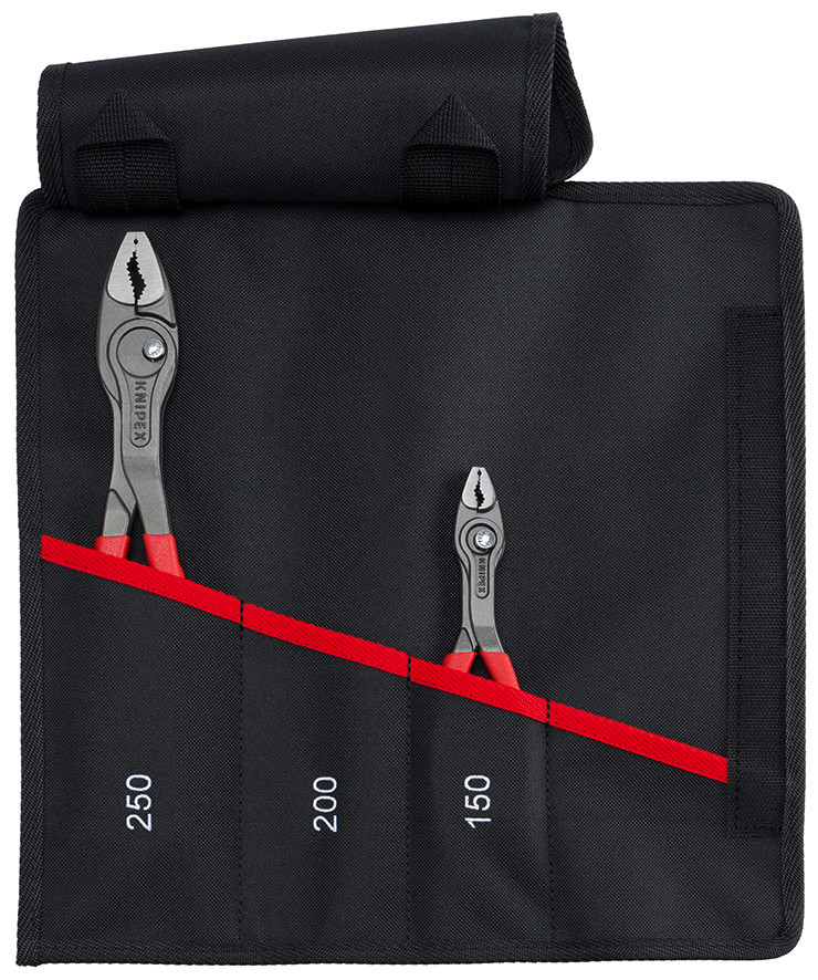 00 19 61 V02 KNIPEX TwinGrip Frontgreifzange-Set Greifen, Anziehen und Lösen von Schrauben mit verschlissenen Köpfen und Antrieben. Effizient arbeiten durch einzigartige Kombination: Frontgreif- und Seitengreif-Funktion, durchgestecktes Gelenk, Druckknopfverstellung. Hochwertige Rolltasche aus strapazierfähigem Polyester-Gewebe mit Klettverschluss. Abmessungen, geöffnet (L x H ): 430 x 325 mm. Bestückt mit KNIPEX TwinGrip in den Längen 150 und 250 mm. Lieferumfang: 1 x 82 01 150 KNIPEX TwinGrip Front- und Seitengreifzange (150 mm), 1 x 82 01 250 KNIPEX TwinGrip Front- und Seitengreifzange (250 mm),.