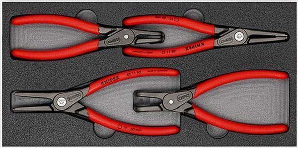 00 20 01 V09 Zangen-Set In Schaumstoffeinlage für Werkbank und Werkstattwagen. Zur übersichtlichen Aufbewahrung der Werkzeuge. Präzise Mulden für die Aufnahme der Zangen. Abmessungen der Schaumstoffeinlage (B x H x T): 335 x 33 x 165 mm. Werkstoff: zweifarbiger, geschlossenporiger Schaumstoff. vier Präzisions-Sicherungsringzangen in Schaumstoffeinlage. Lieferumfang: 1 x 48 11 J2 KNIPEX Präzisions-Sicherungsringzange für Innenringe in Bohrungen (Ø 19 - 60 mm), 1 x 48 21 J21 KNIPEX Präzisions-Sicherungsringzange für Innenringe in Bohrungen (Ø 19 - 60 mm), 1 x 49 11 A2 KNIPEX Präzisions-Sicherungsringzange für Außenringe auf Wellen (Ø 19 – 60 mm), 1 x 49 21 A21 KNIPEX Präzisions-Sicherungsringzange für Außenringe auf Wellen (Ø 19 – 60 mm),