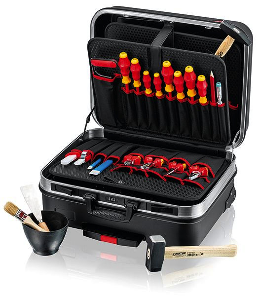 00 21 06 HL S Werkzeugkoffer "BIG Basic Move" Elektro Bestückt mit sechs KNIPEX-Werkzeugen, insgesamt 24 Markenwerkzeugen, teilweise VDE-geprüft nach DIN EN 60900. Insgesamt 54 Steckmöglichkeiten. Max. Zuladung: 20 kg. 33 Liter Fassungsvermögen. Im Boden eingelassener Teleskopgriff sowie zwei außen liegende, leicht laufende Skater-Rollen. Zwei Metall-Kippschlösser und ein dreistelliges Zahlencodeschloss zum sicheren Verschließen des Deckels. Beschriftungsfeld mit zwei Aufklebern zur individuellen Kennzeichnung. Stabiler, ergonomischer Tragegriff. Strapazierfähige Ausführung aus ABS-Material, schwarz. Umlaufender Aluminiumrahmen. Metallscharniere. Dokumentenfach im Deckel. Zwei herausnehmbare Werkzeugtafeln aus schmutzabweisenden PP-Hohlkammerplatten mit 31 bestückbaren Werkzeugtaschen. Erste Werkzeugtafel mit zehn Werkzeugtaschen und einer elastischen Schlaufe auf der Deckelseite und elf schmalen und einer großen Werkzeugtasche auf der Bodenseite. Zweite Werkzeugtafel mit zehn schmalen Werkzeugtaschen und einer elastischen Schlaufe auf der Bodenseite und einem Dokumentenfach auf der Deckelseite. Bodenschale, per Druckknopf fixierbar, Höhe 70 mm, durch Einsätze weiter unterteilbar und Abdecktafel mit 14 großen Werkzeugtaschen. - Abmessung Breite außen (innen): 430mm 350mm - Abmessung Höhe außen (innen): 280mm 200mm - Abmessung Tiefe außen (innen): 515mm 480mm Lieferumfang: 1 x 11 06 160 KNIPEX Abisolierzange mit Öffnungsfeder, universal (Ø 5,0 mm / 10,0 mm²), 1 x 98 52 KNIPEX Kabelmesser (190 mm), 1 x 03 06 180 Knipex Kombizange (180 mm), 1 x 70 06 160 Knipex Seitenschneider (160 mm), 1 x 26 16 200 Knipex Flachrundzange mit Schneide (Storchschnabelzange) (200 mm), 1 x 005655 Wera Spannungsprüfer, einpolig 247 (0,5 x 3,0 x 70 mm), 1 x 031580 Wera Schraubendreher für Schlitzschrauben 1160 i (0,4 x 2,5 x 80 mm), 1 x 031582 Wera Schraubendreher für Schlitzschrauben 1160 i (0,6 x 3,5 x 100 mm), 1 x 031587 Wera Schraubendreher für Schlitzschrauben 1160 i (1,0 x 5,5 x 125 mm), 1 x 031588 Wera Schraubendreher für Schlitzschrauben 1160 i (1,2 x 6,5 x 150 mm), 1 x 031601 Wera Schraubendreher, Kreuzschlitz Phillips® 1162 i (PH1 x 80 mm), 1 x 031603 Wera Schraubendreher, Kreuzschlitz Phillips® 1162 i (PH2 x 100 mm), 1 x 31611 Wera Schraubendreher, Kreuzschlitz Pozidriv® 1165 i (PZ1 x 80 mm), 1 x 31613 Wera Schraubendreher, Kreuzschlitz Pozidriv® 1165 i (PZ2 x 100 mm), 1 x 306125 Haunstetter PUK®-Säge (150 x 240 mm), 1 x 75040-015 Picard Flachpinsel (40 mm), 1 x 75063-000 Picard Gipsbecher (127 x 94), 1 x 361 252 1 Rennsteig Elektrikermeißel (250 x 10 mm), 1 x 340 250 1 Rennsteig Maurermeißel (250 mm), 1 x 15212 Stabila Zimmermannsbleistift, 1 x 3185-04 Maurerfreund Malerspachtel 40 mm, Holz hochwertig (40 mm), 1 x 16 20 165 SB KNIPEX Abmantelungswerkzeug mit Schleppklinge (Ø 8,0 – 28,0 mm), 1 x 3003010119 Ruthe Schlosserhammer, 300 g (300 g), 1 x 3010030119 Ruthe Fäustel (1000 g),