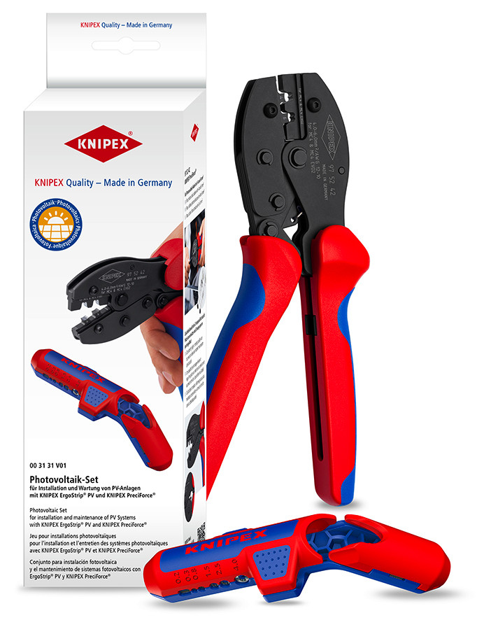 | Kurzbeschreibung | KNIPEX 00 31 31 V01 SB Photovoltaik-Installationsset mit ErgoStrip® PV und KNIPEX PreciForce® 53 mm |
