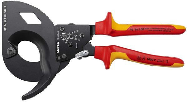 | Kurzbeschreibung | KNIPEX 95 36 280 Kabelschneider (Ratschenprinzip) isoliert mit Mehrkomponenten-Hüllen, VDE-geprüft schwarz lackiert 280 mm |