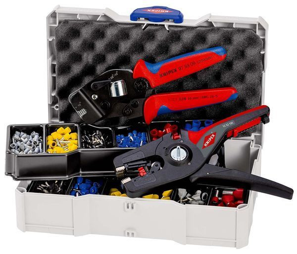 97 90 15 Crimp-Sortiment Im TANOS MINI-systainer® (stabile Kunststoffbox). Zwei stapelbare Kunststoffeinsätze mit je sechs Mulden für Verbinder. Mit einem Sortiment Aderendhülsen mit / ohne Kunststoffkragen. T-Loc-Verschluss für Einhandbedienung: mit einem Dreh den systainer® öffnen oder schließen und mit einem zweiten systainer® verbinden.. mit Crimpzange für Aderendhülsen 97 53 09 und automatische Abisolierzange KNIPEX PreciStrip16® 12 52 195. systainer® ist ein eingetragenes Warenzeichen der TANOS GmbH. Lieferumfang: 1 x 97 53 09 KNIPEX Selbsteinstellende Crimpzange für Aderendhülsen mit Fronteinführung (0,08 – 10 + 16 mm²), 100 x KNIPEX Twin-Aderendhülsen mit Kunststoffkragen (2 x 1,5 mm²), 80 x KNIPEX Twin-Aderendhülsen mit Kunststoffkragen (2 x 2,5 mm²), 40 x KNIPEX Twin-Aderendhülsen mit Kunststoffkragen (2 x 4,0 mm²), 30 x KNIPEX Twin-Aderendhülsen mit Kunststoffkragen (2 x 6,0 mm²), 20 x KNIPEX Twin-Aderendhülsen mit Kunststoffkragen (2 x 10,0 mm²), 150 x KNIPEX Aderendhülsen mit Kunststoffkragen 14 / 8 mm (1,5 mm²), 100 x KNIPEX Aderendhülsen mit Kunststoffkragen 14 / 8 mm (2,5 mm²), 80 x KNIPEX Aderendhülsen mit Kunststoffkragen 17 / 10 mm (4 mm²), 50 x KNIPEX Aderendhülsen mit Kunststoffkragen 20 / 12 mm (6 mm²), 35 x KNIPEX Aderendhülsen mit Kunststoffkragen 22 / 12 mm (10 mm²), 20 x KNIPEX Aderendhülsen mit Kunststoffkragen 24 / 12 mm (16 mm²), 1 x 12 52 195 KNIPEX PreciStrip16® Automatische Abisolierzange (0,08 - 16 mm²),