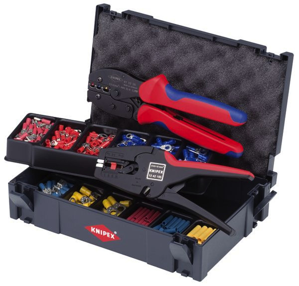 97 90 22 Crimp-Sortiment Im TANOS MINI-systainer® (stabile Kunststoffbox). T-Loc-Verschluss für Einhandbedienung: mit einem Dreh den systainer® öffnen oder schließen und mit einem zweiten systainer® verbinden.. Öffnen im verknüpften Zustand: Einfach und schnell auf die Inhalte zugreifen, ohne die Verbindung zu lösen.. Zwei stapelbare Kunststoffeinsätze mit je sechs Mulden für Verbinder. Mit einem Sortiment gebräuchlicher Kabelverbinder. mit automatischer Abisolierzange KNIPEX Multistrip 10 (12 42 195). mit selbsteinstellender Crimpzange KNIPEX PreciForce® 97 52 36 (für isolierte Kabelschuhe und Verbinder). systainer® ist ein eingetragenes Warenzeichen der TANOS GmbH. Lieferumfang: 1 x 12 42 195 KNIPEX MultiStrip 10 Automatische Abisolierzange (0,03 – 10,0 mm²), 1 x 97 52 36 KNIPEX PreciForce® Crimpzange (0,5 – 6,0 mm²), 25 x KNIPEX Stoßverbinder, isoliert gelb (25 x 4,0-6,0 mm²), 25 x KNIPEX Stoßverbinder, isoliert blau (25 x 1,5-2,5 mm²), 25 x KNIPEX Stoßverbinder, isoliert rot (25 x 0,5-1 mm²), 25 x KNIPEX Kabelschuhe, Ringform Ø 8 mm (25 x 4,0-6,0 mm²), 25 x KNIPEX Kabelschuhe, Ringform Ø 6 mm (25 x 1,5-2,5 mm²), 25 x KNIPEX Kabelschuhe, Ringform Ø 5 mm (25 x 1,5-2,5 mm²), 25 x KNIPEX Kabelschuhe, Ringform Ø 4 mm (1,5-2,5 mm²), 25 x KNIPEX Kabelschuhe, Ringform Ø 5 mm (25 x 0,5-1 mm²), 25 x KNIPEX Kabelschuhe, Ringform Ø 4 mm (25 x 0,5-1 mm²), 25 x KNIPEX Flachsteckhülsen 6,3x0,8 mm (25 x 1,5-2,5 mm²), 25 x KNIPEX Flachsteckhülsen 6,3x0,8 mm (25 x 0,5-1 mm²), 25 x KNIPEX Kabelschuhe, Ringform Ø 6 mm (25 x 4,0-6,0 mm²),