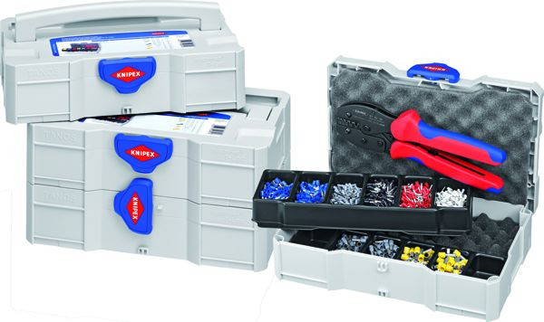 97 90 23 Crimp-Sortiment Im TANOS MINI-systainer® (stabile Kunststoffbox). T-Loc-Verschluss für Einhandbedienung: mit einem Dreh den systainer® öffnen oder schließen und mit einem zweiten systainer® verbinden.. Öffnen im verknüpften Zustand: Einfach und schnell auf die Inhalte zugreifen, ohne die Verbindung zu lösen.. Zwei stapelbare Kunststoffeinsätze mit je sechs Mulden für Verbinder. Mit einem Sortiment Aderendhülsen mit / ohne Kunststoffkragen. mit Crimpzange KNIPEX PreciForce® 97 52 38 für Aderendhülsen. systainer® ist ein eingetragenes Warenzeichen der TANOS GmbH. Lieferumfang: 1 x 97 52 38 KNIPEX PreciForce® Crimpzange (0,25 – 6,0 mm²), 100 x KNIPEX Aderendhülsen mit Kunststoffkragen 14 / 8 mm (0,5 mm²), 100 x KNIPEX Aderendhülsen mit Kunststoffkragen 14 / 8 mm (0,75 mm²), 200 x KNIPEX Aderendhülsen mit Kunststoffkragen 14 / 8 mm (1 mm²), 200 x KNIPEX Aderendhülsen mit Kunststoffkragen 14 / 8 mm (1,5 mm²), 200 x KNIPEX Aderendhülsen mit Kunststoffkragen 14 / 8 mm (2,5 mm²), 200 x KNIPEX Aderendhülsen mit Kunststoffkragen 17 / 10 mm (4 mm²), 200 x KNIPEX Aderendhülsen mit Kunststoffkragen 20 / 12 mm (6 mm²),