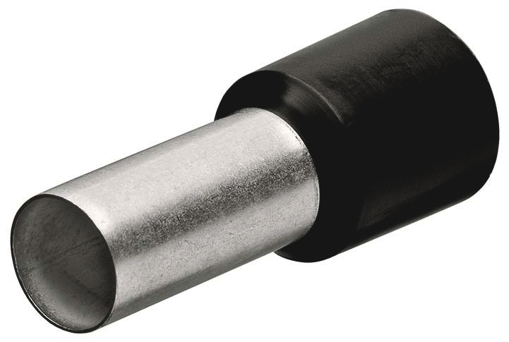 97 99 333 Aderendhülsen mit Kunststoffkragen Einführtrichter aus Polypropylen. Wärmebeständig bis 105 °C. Werkstoff: E-Cu. Oberfläche galvanisch verzinnt. Mindestschichtdicke 3 µm. UL-Zertifiziert. Nenngröße: 1,5 mm². Inhalt: 200 Stück. Kennfarbe: schwarz. Kabel 1,5mm² AWG 16 Kennfarbe schwarz L1 14mm L2 8mm d1 1,7mm d2 3,5mm S1 0,15mm S2 0,25mm Menge 200 Isolation PP Werkstoff Kupfer Oberfläche reinverzinnt