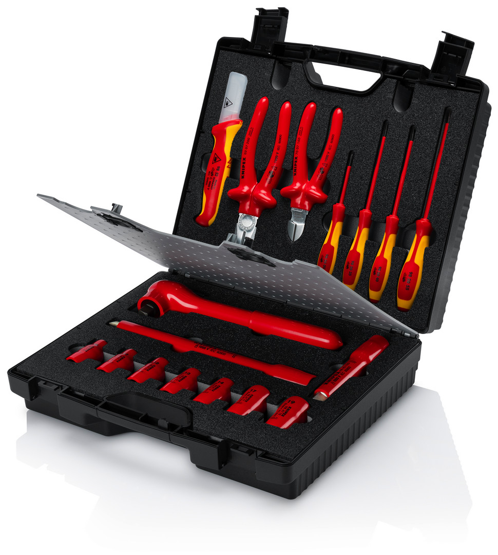 98 99 11 Kompaktkoffer bestückt mit einem Sortiment gebräuchlicher isolierte KNIPEX-Werkzeuge für Arbeiten an elektrischen Anlagen. alle Werkzeuge sind stückgeprüft und erfüllen die Anforderungen von ASTM F1505 und IEC 60900. Schlagfester Kunststoffkoffer. Schaumstoffeinlage mit präzisen Mulden für die Aufnahme der Werkzeuge. Abmessungen, außen (B x H x T): 380 x 85 x 260 mm. Abmessungen, innen (B x H x T): 335 x 70 x 230 mm. - Innenfächer: 17Stk - Abmessung Breite außen (innen): 380mm 335mm - Abmessung Höhe außen (innen): 85mm 70mm - Abmessung Tiefe außen (innen): 260mm 230mm Lieferumfang: 1 x 98 52 KNIPEX Kabelmesser (190 mm), 1 x 98 47 10 KNIPEX Steckschlüsseleinsatz für Sechskantschrauben mit Innenvierkant 1/2" (10 mm), 1 x 98 47 11 KNIPEX Steckschlüsseleinsatz für Sechskantschrauben mit Innenvierkant 1/2" (11 mm), 1 x 98 47 12 KNIPEX Steckschlüsseleinsatz für Sechskantschrauben mit Innenvierkant 1/2" (12 mm), 1 x 98 47 13 KNIPEX Steckschlüsseleinsatz für Sechskantschrauben mit Innenvierkant 1/2" (13 mm), 1 x 98 47 14 KNIPEX Steckschlüsseleinsatz für Sechskantschrauben mit Innenvierkant 1/2" (14 mm), 1 x 98 47 17 KNIPEX Steckschlüsseleinsatz für Sechskantschrauben mit Innenvierkant 1/2" (17 mm), 1 x 98 47 19 KNIPEX Steckschlüsseleinsatz für Sechskantschrauben mit Innenvierkant 1/2" (19 mm), 1 x 98 42 KNIPEX Umsteckknarre mit Außenvierkant 1/2" (5 - 50 NM in 0,25 Nm-Schritten), 1 x 98 45 125 KNIPEX Verlängerung mit Innen- / Außenvierkant 1/2" (+ 125 mm), 1 x 98 45 250 KNIPEX Verlängerung mit Innen- / Außenvierkant 1/2" (+ 250 mm), 1 x 03 07 200 KNIPEX Kombizange (200 mm), 1 x 98 24 00 KNIPEX Schraubendreher für Kreuzschlitzschrauben Phillips® (PH0), 1 x 98 20 35 KNIPEX Schraubendreher für Schlitzschrauben (0,6 x 3,5 x 100 mm), 1 x 98 20 40 KNIPEX Schraubendreher für Schlitzschrauben (0,8 x 4 x 100 mm), 1 x 98 20 55 KNIPEX Schraubendreher für Schlitzschrauben (1,0 x 5,5 x 125 mm), 1 x 70 07 160 KNIPEX Seitenschneider (160 mm),