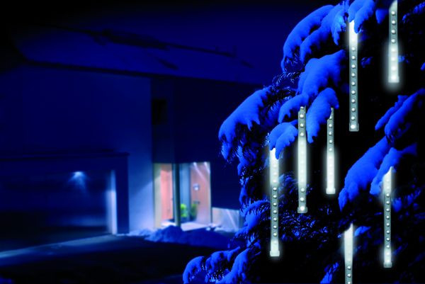 Set mit 6 oder 12 LED-Leuchtstäben, die aufgereihten LEDs sind so gesteuert, dass der Eindruck herabfallender Schneefocken entsteht