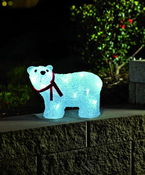 Eisbär klein stehend H: 20 cm Acryl-Figuren für außen , sehr dekorativ mit weißen LEDs , inklusive Außentrafo, 24 V, transparentes Kabel , Zuleitung: 500 cm