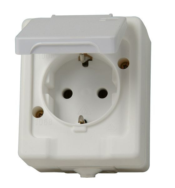 STANDARD - Aufputz Feuchtraum Steckdose, 1-fach, mit Klappdeckel, Nennstrom 16A, Bemessungsspannung 250V~, Schaltvermögen 10AX, Schutzart IP44, Farbe: arktisweiß