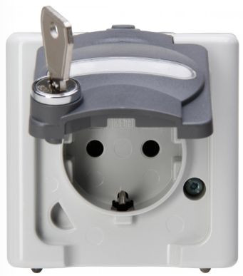 BLUE ELECTRIC - Aufputz-Feuchtraum Schutzkontakt-Steckdose mit Sicherheitsschloss, Klappdeckel mit Beschriftungsfeld, abschließbar mit 2 Schlüsseln, Schließung Typ0, Nennstrom 16A, Bemessungsspannung 250V~, Schutzart IP44, Farbe grau
