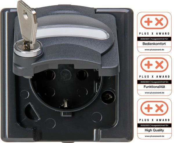 Aufputz-Feuchtraum Schutzkontakt-Steckdose im Design BLUE ELECTRIC, mit Sicherheitsschloss, Klappdeckel mit Beschriftungsfeld, abschließbar mit 2 Schlüsseln, Schließung Typ 3, Bemessungsspannung 250V~, Nennstrom 16A, Schutzart IP44, Farbe: anthrazit