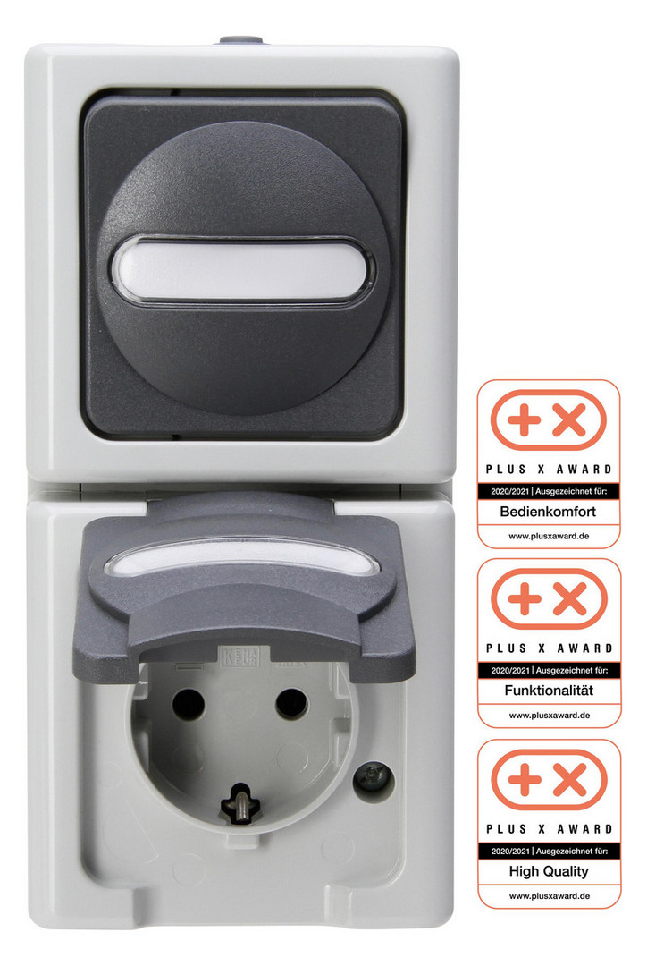 BLUE ELECTRIC - Aufputz-Feuchtraum, Universalschalter (Aus/Wechselschalter) und beleuchtete Schutzkontakt-Steckdosenkombination, beide Geräte mit Beschriftungsfeld, senkrecht, 10AX/16A, 250V~, Schutzart IP44, Farbe: grau
