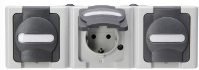 BLUE ELECTRIC - Aufputz-Feuchtraum, Schutzkontakt-Steckdose, 3-fach, fertig verdrahtet, alle Klappdeckel mit Beschriftungsfeld, waagerecht, 16A, 250V~, IP44, Farbe: grau