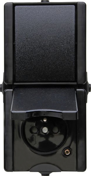 Aufputz-Feuchtraum Aus-/Wechselschalter Mittel-Schutzkontakt- Steckdosenkombination im Design proAQA und der Farbe schwarz in senkrechter Ausführung, Bemessungsspannung liegt bei 250V~. Schaltvermögendes Schalters liegt bei 10AX und der Nennstrom de r Steckdose liegt bei 16A. Schutzart IP44
