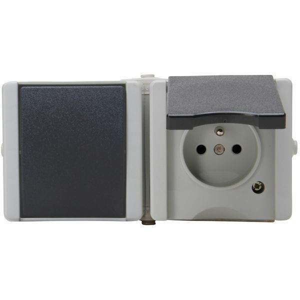 proAQA - Aufputz-Feuchtraum Aus-/Wechselschalter Mittel-Schutzkontakt-Steckdosenkombination in waagrechter Ausführung, mit erhöhtem Berührungsschutz, Bemessungsspannung 250V~, Schaltvermögen des Schalters 10AX, Nennstrom der Steckdose 16A, Schutzart IP44, Farbe: grau