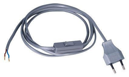 Europa-Zuleitung, Europa-Stecker, abgemanteltes Leitungsende mit Aderendhülsen und 1-poligem Schnurzwischenschalter, Leitung H03VVH2-F 2x0,75mm², 1-polig, 2A, 250V~, 2m, Farbe: stahl