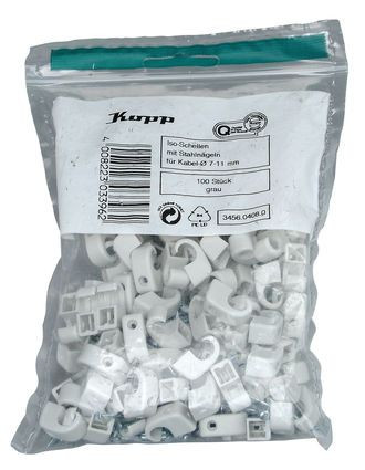 | Kurzbeschreibung | Iso-Nagelschellen, 7-10mm, mit gehärteten 30mm-Stahlstiften, grau, 100 Stück |