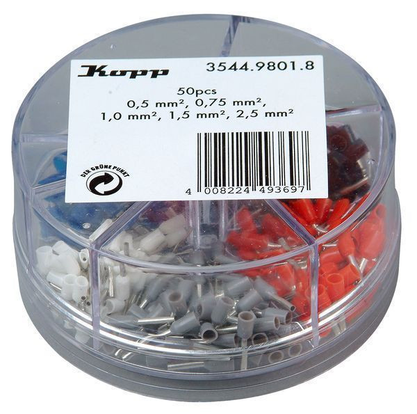 Aderendhülsen Sortimentsbox 0,5-2,5mm² mit Kunststoffkragen, Inhalt: je 50 Stück 0,5mm², 0,75mm², 1mm², 1,5mm², 2,5mm²
