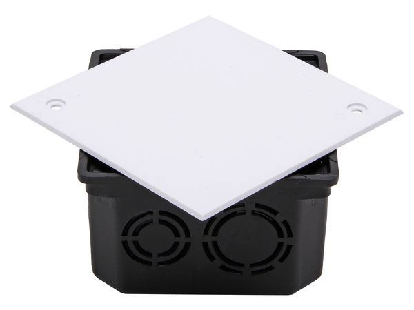 Abzweigkasten mit Randdeckel, 75x75mm, Farbe: schwarz, Farbe Deckel: weiß, IP30, max. 400V, 5x Eingang bis M20, 5x Eingang bis M25, zur Verlegung unter Putz, mit leicht ausbrechbaren
