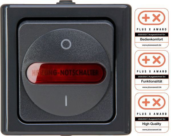 BLUE ELECTRIC - Aufputz-Feuchtraum, Heizungs-Hauptschalter, Aus: 2-polig, rotes Sichtfenster, Schrifteinlage "Heizungs-Notschalter" beleuchtet, Schaltvermögen 10AX, Bemessungsspannung 250V~, Schutzart IP44, Farbe: anthrazit