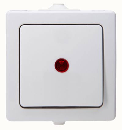 Aufputz-Feuchtraum Kontrollschalter (Aus-/Wechselschalter), mit Linse und eingesetzter Glimmlampe (beleuchtet) im Design NAUTIC und der Farbe arktisweiß mit einer Bemessungsspannung von 250V~ sowie einem Schaltvermögen vo n 10AX. Schutzart IP44