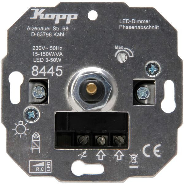 Druck-Wechselschalter - LED Dimmer, für Glüh- und 230V-Halogenlampen, dimmbare LED´s sowie für NV-Halogenlampen mit elektronischen Trafos, einstellbare Grundhelligkeit, mit Softrastung, Welle 4mm, Phasenabschnitt RC 15-150W/VA, LED 3-50W, mit Befestigungsmutter und Wellenadapter