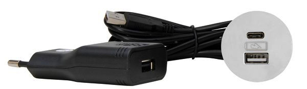 VersaPICK (metall) , USB Einbauset mit 1x USB-A und 1x USB-C Anschluss, mit ca. 2 m USB-A Anschlusskabel und Netzadapter (max. 18W), Ausführung: rund, Farbe:matt weiß RAL9010