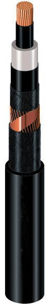 Aufbau: Mehrdrähtiger Kupferleiter, innere Leiterschicht, Aderisolation aus vernetztem Polyethylen (VPE), äußere Leiterschicht, Kupferschirm mit Querleitwendel, PE-Außenmantel, Farbe: schwarz