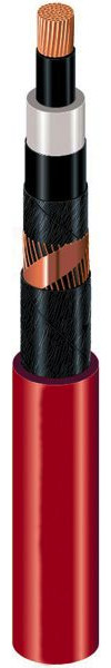 Aufbau: Mehrdrähtiger Kupferleiter, innere Leiterschicht, Aderisolation aus vernetztem Polyethylen (VPE), äußere Leiterschicht, Kupferschirm mit Querleitwendel, PVC-Außenmantel, Farbe: rot