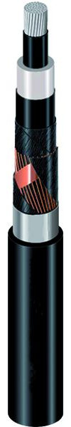 Aufbau: Mehrdrähtiger Aluminiumleiter, innere Leiterschicht, Aderisolation aus vernetztem Polyethylen (VPE), äußere Leiterschicht, längswasserdichtes leitfähiges Quellflies. Kupferschirm mit Querleitwendel, querwasserdichtes leitfähiges Quellflies, Aluminiumband verschweißt mit PE-Außenmantel, Farbe: schwarz