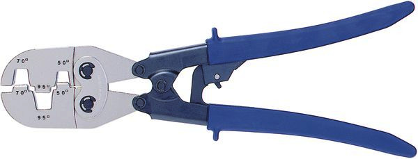 Crimpzange für sehr große Aderendhülsen von 50 - 95 mm², Zum Verpressen von isolierten und unisolierten Aderendhülsen, Zwangssperre garantiert vollständige Verpressung, 3 Pressmatrizen mit seitlicher Einführung: 50/ 70/ 95 mm²,