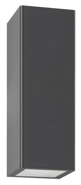 Pulverbeschichtete Leuchte, Diffusor aus Floatglas. Farbe Graphit, Material Edelstahl, Flachglas, Lichtquelle: 2 x GU10, 2 x 35 Watt, 220-240 V, 50-60 Hz, Schutzklasse I, Maß: 220x80x80