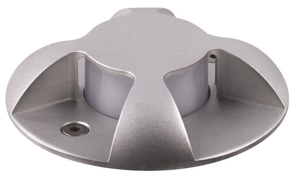 Eloxierte Leuchte aus Aluminium, Diffusor aus Polycarbonat Opal. Inkl. Bodeneinbauhülse. Farbe Hellgrau, Material Aluminium-Druckguss, Flachglas, Lichtquelle: 1 x LED, 5 Watt, ca. 3000 K, 400 lm, Abstrahlwinkel 40° / 40° / 40° / 40°, CRI > 80, 220-240 V, 50-60 Hz, IP67, Schutzklasse II, Maß: 18x80x180 Ø80