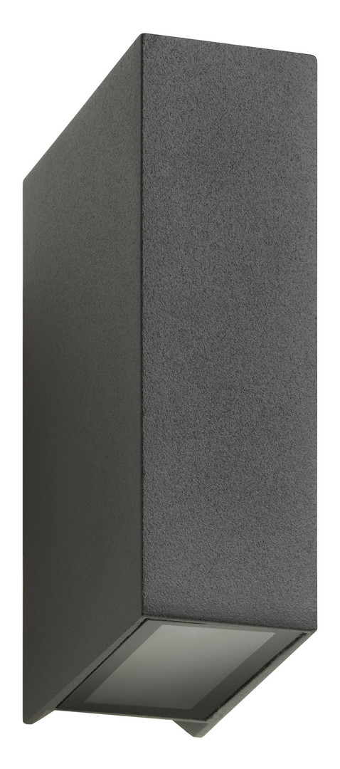 Pulverbeschichtete Up and Down Wandleuchte aus Aluminium-Druckguss, graphit, Diffusor aus Floatglas, 2x LED 4W, ca. 3000 K, 710 lm, Schaltzyklen 150.000+, Abstrahlwinkel 2x 65°, IP54, BxHxT 43x125x90 mm