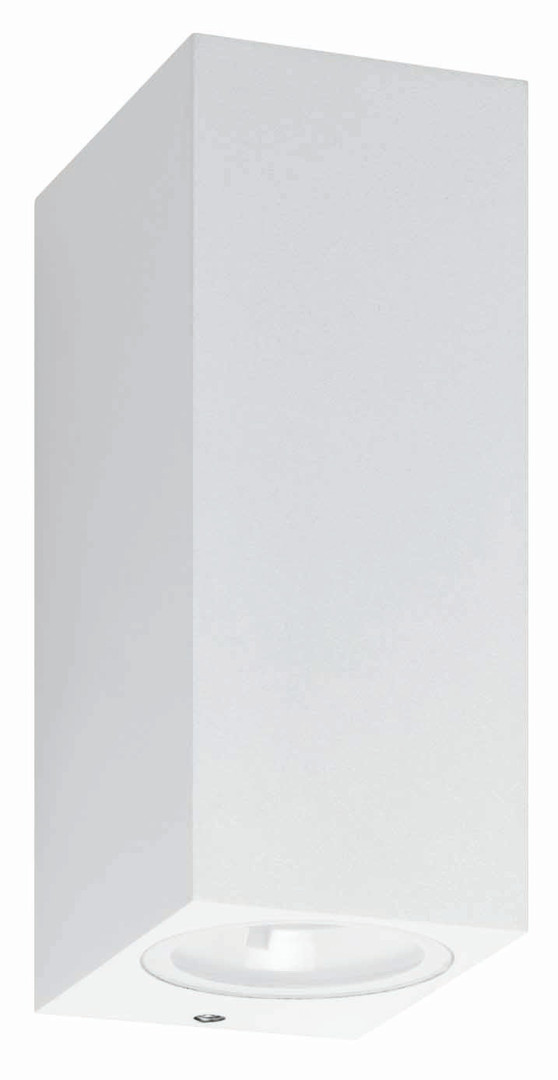 Pulverbeschichtete Leuchte aus Aluminium-Druckguss, Diffusor aus Floatglas. Inklusive LED-Leuchtmittel. Farbe Weiß, Material Aluminium-Druckguss, Flachglas, Lichtquelle: 2 x LED, 2 x 7 Watt, ca. 3000 K, 1500 lm, Abstrahlwinkel 69° / 69°, CRI > 80, 220-240 V, 50-60 Hz, IP54, Schutzklasse I, Maß: 145x62x82
