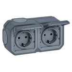 Plexo New Feuchtraum-Aufputz 2-fach vorverdrahtete Schutzkontakt-Steckdose horizontal Steckklemmen (SL) mit erhöhtem Berührungsschutz, IP 44, IK 08, in der Farbe: Grau