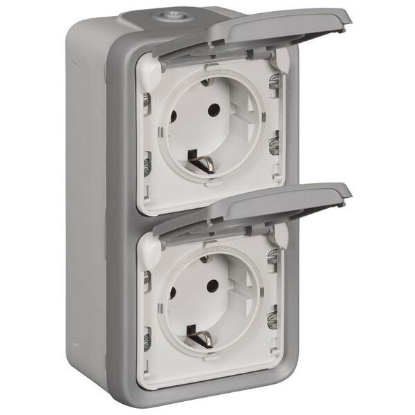 Kurzbeschreibung Feuchtraum Aufputz Schutzkontaktsteckdose 2-Fach Vertikal Grau