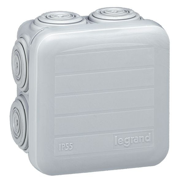 Legrand Abzweigdose Plexo, Quadratisch 65 x 65 x 40 mm (H x B x T), Schutzart IP 55 – IK 07, 7 Membran-Einführungen, Deckel zum Aufschnappen, Lichtgrau RAL 7035, selbstverlöschend 650°C, Beschriftbarer Deckel.
