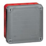 Legrand Abzweigdose Plexo. Quadratisch 105 x 105 x 55 mm (H x B x T), Schutzart IP 55 – IK 07, mit 7 Vorprägungen für metrische Leitungseinführung, Deckel mit 1/4-Drehung Schnellverschluss, Rot RAL 3000/Grau RAL 7037, zur Kennzeichung von Sicherheitsbeleuchtungsstromkreisen gemäß DIN VDE 0105, selbstverlöschend 960°C, beschriftbarer Deckel.