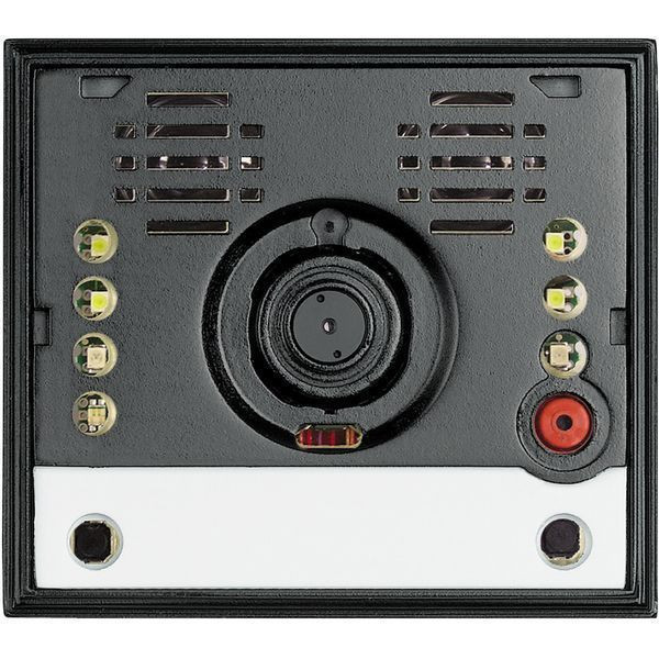 Farb-Video-Türlautsprecher-Modul mit Ruftasten für Türstationen SFERA 2-Draht zum Einbau in die Modulträger für UP-Montage. LED-Modulbeleuchtung Namensschilder. Anschluss mit steckbaren Anschlussklemmen für BUS-Leitung und Türöffner. Verbindung weiterer Funktions-Module mit Flachbandkabel.
