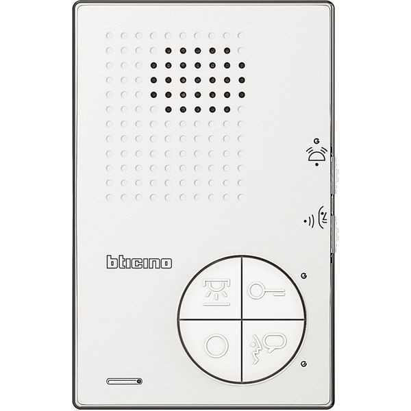 Hausstation CLASSE 100 A12B. Hörerlose Audio-Hausstation in 2-Drahttechnik für Wand- oder Tischmontage (Tischzubehör separat erhältlich). Verfügt über 4 Bedientasten für: Tür öffnen, Gespräch annehmen, Treppenhauslicht einschalten (Aktivator Art. 346210 wird benötigt) und Türstation ein- bzw. umschalten. 16 melodische Ruftöne einstellbar. Für Tür-/Etagenruf mit Rufunterscheidung. Des Weiteren enthalten sind Drehregler für Lautstärke von Rufton und Gespräch. Anschluss für BUS und Etagenruf. Maße B × H × T: 90 × 140 × 27 mm