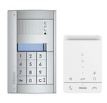 Flex’ONE Audio-Set mit Türstation SFERA + Codelock und Hausstation CLASSE 100 A16EDas Set in 2-Draht-Technik enthält alle benötigten Teile zur Realisierung einer Einfamilienhaus-Sprechanlage. Die Erweiterung auf ein Zweifamilienhaus erfolgt durch das Hinzufügen einer 2. Hausstation nach Wahl. Das Set besteht aus:- 1 Unterputz-Türstation SFERA in der Ausführung Allmetal. Wird mit 2 Frontblenden (1 und 2 Ruftasten) ausgeliefert und kann somit als Ein- oder Zweifamilienhaus konfiguriert werden. Ausgestattet mit Namensschild inkl. Integriertem Helligkeitssensor zum automatischen Einschalten der Hintergrundbeleuchtung (weiße LEDs) bei Dunkelheit. Status-LEDs für die Betriebszustände: Tür offen, Kommunikation aktiv, Ruf getätigt und System besetzt. Der Türöffner (max. 30 Ohm Innenwiderstand) wird direkt an die Klemmen S+ und S– (18 V, 4 A Stoßstrom, 250 mA Haltestrom) angeschlossen. Das integrierte Codelock-Modul aktiviert das REG-Türöffnerrelais Best.Nr. 346230 (im Lieferumfang), das Türöffnerrelais direkt am Lautsprechermodul oder den Wechselkontakt (C-NO-NC) welcher am Codelockmodul selbst enthalten ist. Status-LED zur Anzeige des Zugangsstatus. Nächtliche LED-Hintergrundbeleuchtung.Schutzart IP 54, Schlagfestigkeit IK 08; Abmessungen: B × H: 138 × 235 mm; Farbe: ähnlich RAL 9018- 1 Video-Netzgerät- 1 REG-Türöffnerrelais Best.Nr. 346230- 1 hörerlose Aufputz-Hausstation CLASSE 100 A16EFreies Gegensprechen, neben den beiden physischen Gesprächstasten (Gespräch annehmen bzw. beenden) verfügt sie über 3 Sensortasten für: Tür öffnen, Treppenhauslicht einschalten (Aktivator Best.Nr. 346210 wird benötigt) und Türstation ein- bzw. umschalten sowie über 4 frei konfigurierbare Zusatztasten (z. B. Intern Sprechen, zusätzlicher Türöffner, etc.). 16 melodische Ruftöne einstellbar. Inkl. Arztschaltung/Türomatfunktion. Für Tür-/Etagenruf mit Rufunterscheidung. Die Lautstärke des Ruftons wird mittels seitlichem Regler eingestellt. LED-Anzeige für: Ruftonabschaltung, Türöffner- und Verbindungsstatus. Aufputzmontage mittels mitgelieferter Wandhalterung. Ein Tischzubehör (Best.Nr. 344692) ist separat erhältlich. Anschluss für BUS, Etagenruf und Zusatzläutewerk. Maße B × H × T: 102 × 155 × 18,5 mm- Schaltplan und Bedienungsanleitungen