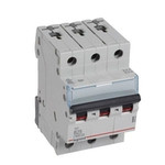 Legrand Leitungsschutzschalter TX3 nach EN 60898-1, VDE 0641-11, EN 60947-2, 3-polig, B-Charakteristik, Bemessungsstrom In 25 A, Bemessungsschaltvermögen Icn 6 kA nach EN 60898-1, Bemessungsspannung Un 400 VAC, Bemessungsfrequenz 50/60 Hz, Energiebegrenzungsklasse 3, Befestigung auf Hutprofilschiene EN 60715 durch eine rastende Schnellbefestigung, klare Information vorne auf jedem Gerät, eindeutige Schaltstellungsanzeige rot/grün am Schalthebel, mit Beschriftungsfenster, mit Untersteckschutz zum sicheren Einführen des Leiters in Fahrstuhlklemme, Anbau von Hilfsgeräten möglich. Leitungsschutzschalter mit B-Charakteristik sind vornehmlich für den Leitungsschutz in Licht- und Steckdosen-Stromkreisen bestimmt.