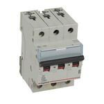 Legrand Leitungsschutzschalter TX3 nach EN 60898-1, VDE 0641-11, EN 60947-2, 3-polig, D-Charakteristik, Bemessungsstrom In 3 A, Bemessungsschaltvermögen Icn 6 kA nach EN 60898-1, Bemessungsspannung Un 400 VAC, Bemessungsfrequenz 50/60 Hz, Energiebegrenzungsklasse 3, Befestigung auf Hutprofilschiene EN 60715 durch eine rastende Schnellbefestigung, klare Information vorne auf jedem Gerät, eindeutige Schaltstellungsanzeige rot/grün am Schalthebel, mit Beschriftungsfenster, mit Untersteckschutz zum sicheren Einführen des Leiters in Fahrstuhlklemme, Anbau von Hilfsgeräten möglich. Leitungsschutzschalter mit D-Charakteristik sind für den Leitungsschutz in Kraftstromkreisen mit sehr hohen Einschaltströmen vorzusehen (z.B. Schweißtrafos).
